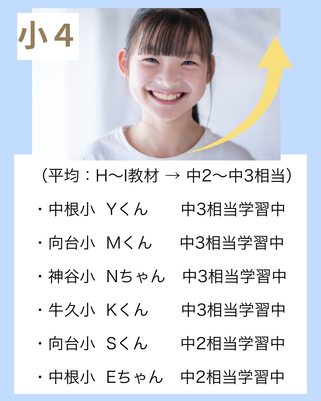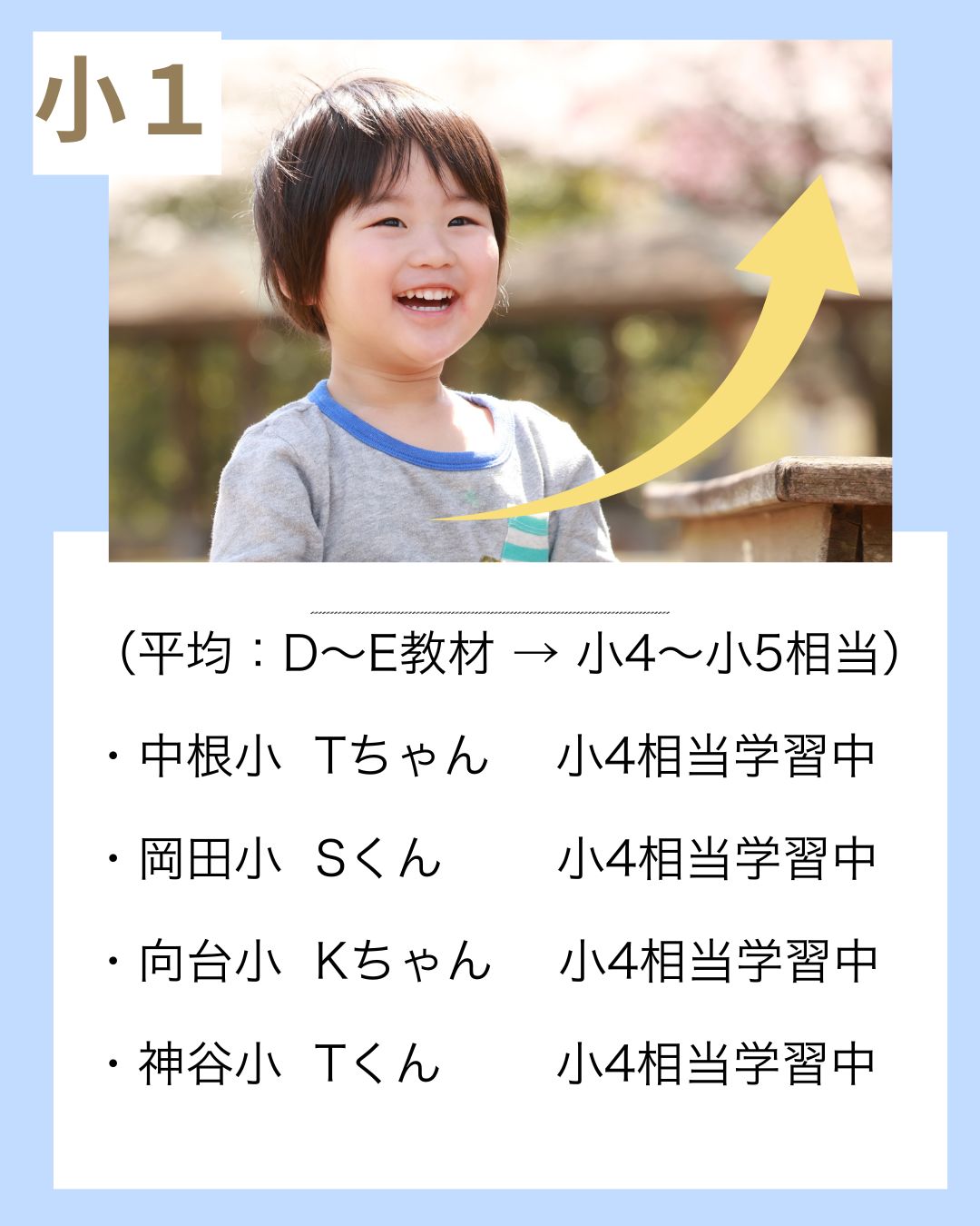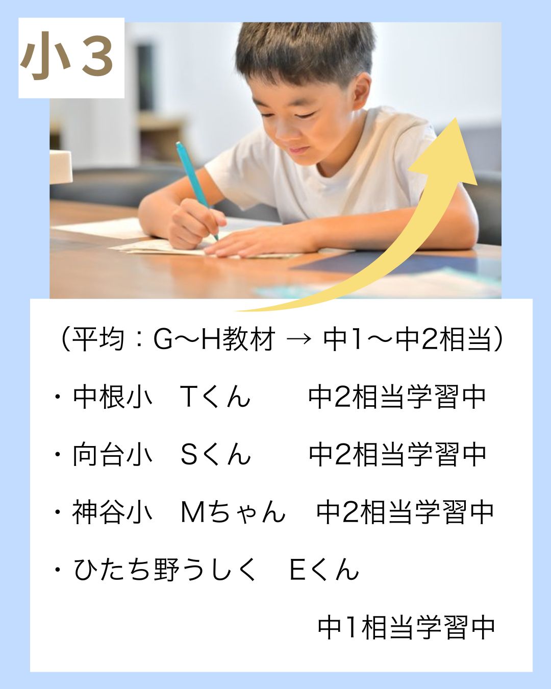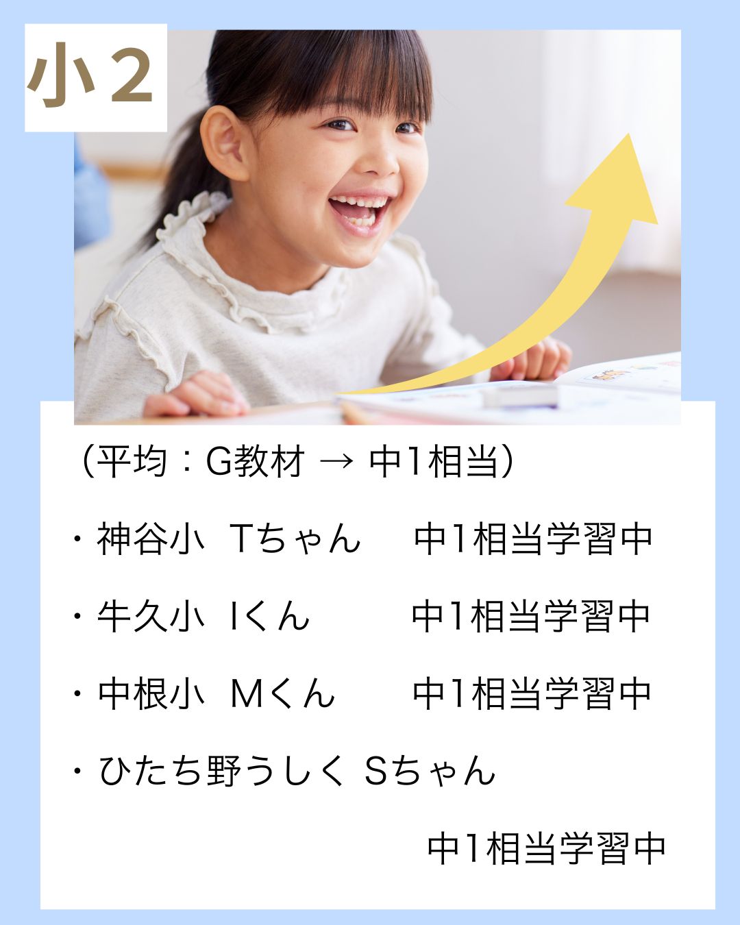 当教室の平均は、全国基準を大きく上回り、小1で小4の内容、小2で中1の内容を学習します。