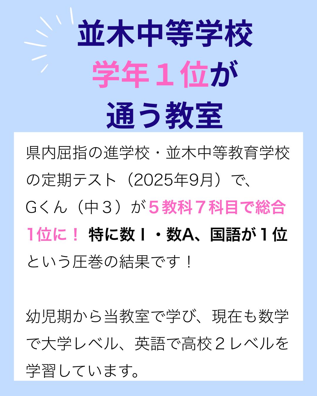 市内の各々の中学校で当教室出身の生徒さんたちが学年トップにたくさんいます。外部模試で偏差値70を超える生徒さんが続々と誕生しています。